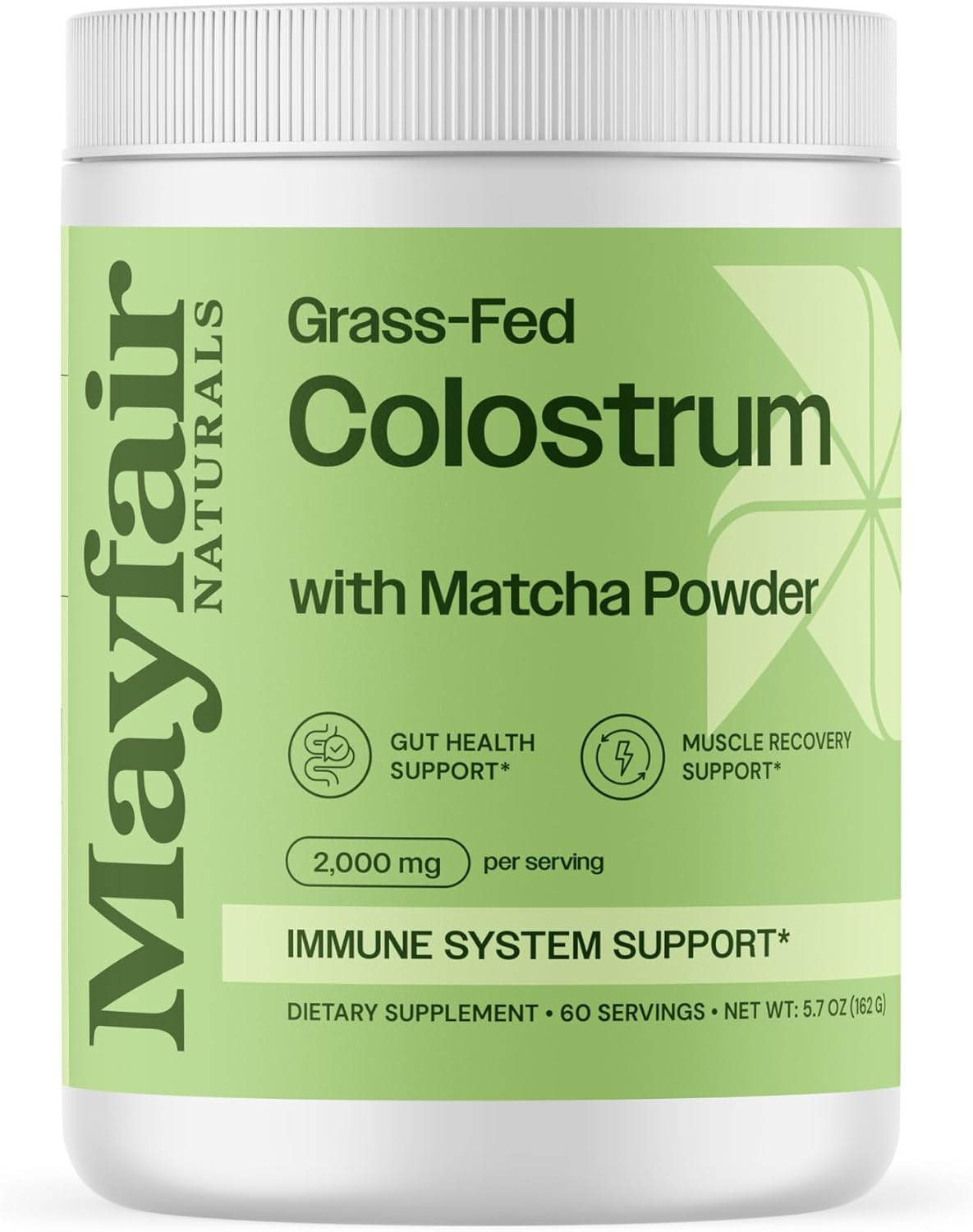 Mayfair Naturals Grass-Fed Colostrum with Matcha Green Tea Powder combines 2,000 mg of premium colostrum with 637 mg of organic matcha per serving to support immune health, gut function, and muscle recovery. This unique blend delivers natural benefits with a delicious taste.